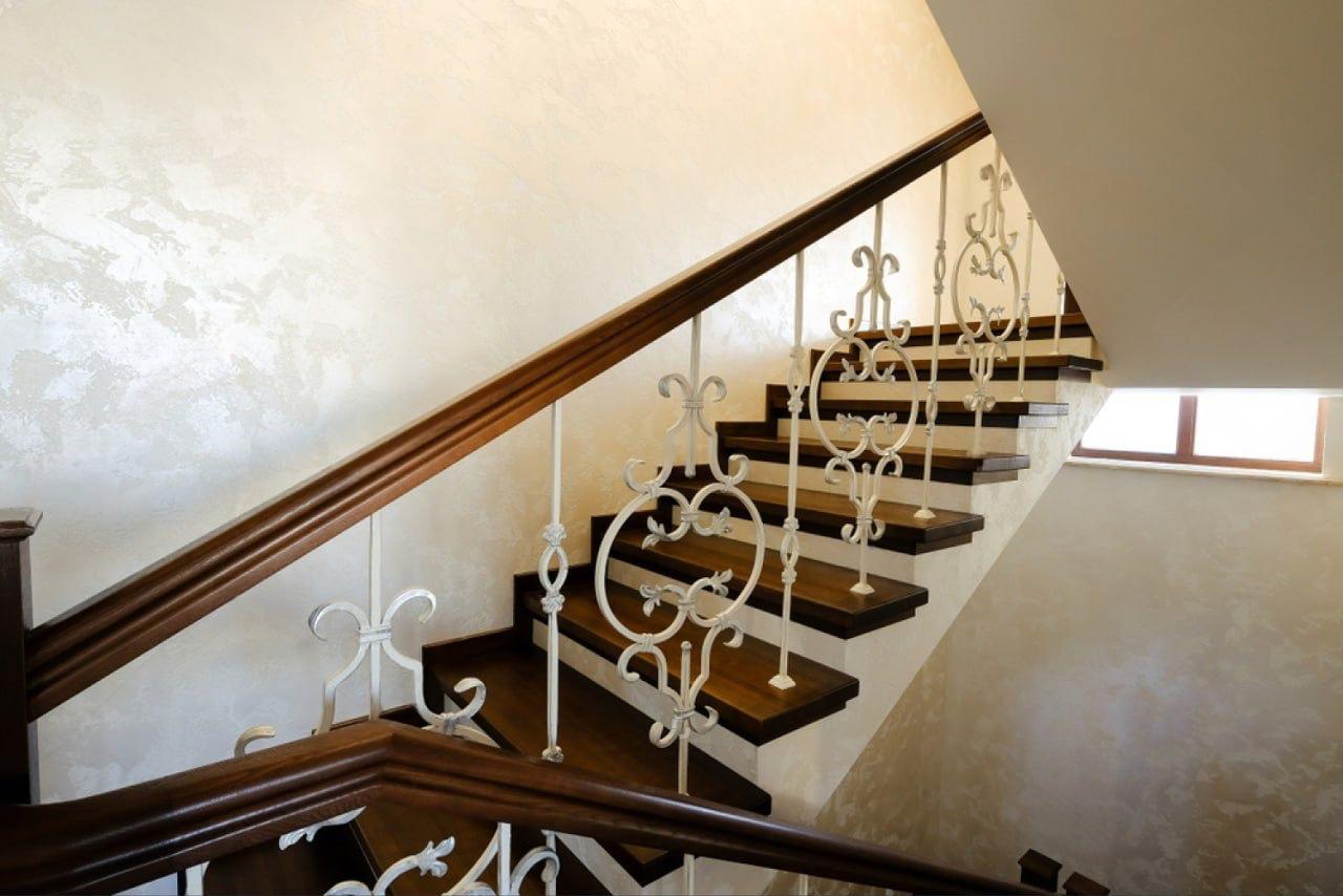 В основе дизайна лежит игра на контрастах. Массивные ступени и перила из темного, благородного дуба задают тон роскоши и надежности. Им противопоставлены изящные фигурные балясины белого цвета, которые придают конструкции визуальную легкость. Особый шик проекту добавляют подступенки, отделанные светлой декоративной штукатуркой, которые идеально перекликаются со светлой венецианской штукатуркой на стенах.
